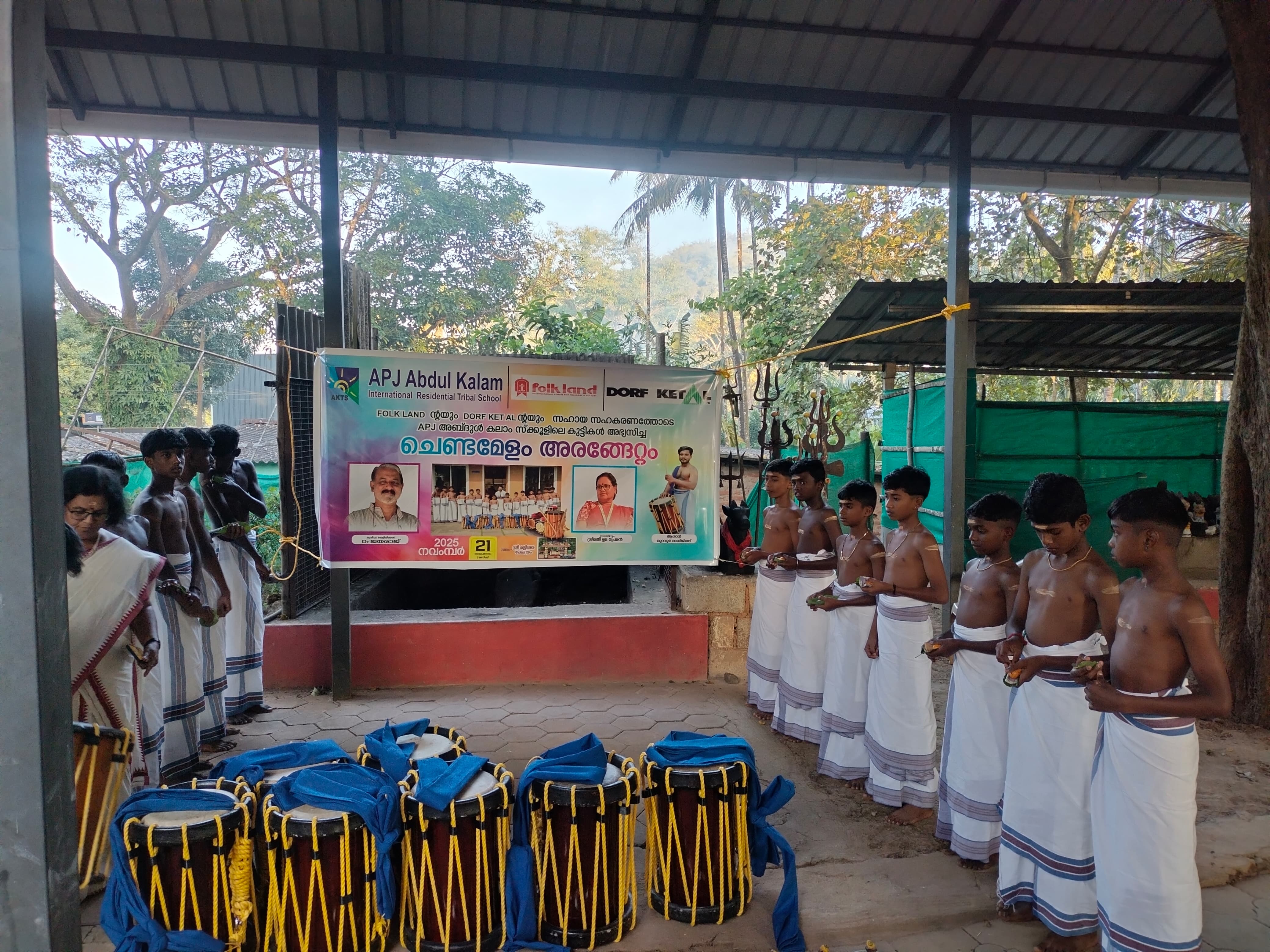Folkland, with the CSR support of Dorf Ketal, successfully completed an eight-month Chenda Melam training programme for students of APJ Abdul Kalam International Residential Tribal School, Attappadi. The valedictory programme was presided over by Mrs Uma Preman, with an introductory address by Mr P. J. James, and inaugurated by Dr V. Jayarajan, Chairman of Folkland, who highlighted the cultural significance of traditional percussion in connection with World Heritage Week (19–25 November 2025). The students’ Arangettam was held at Malleswaran Kovil, Chemmannur, a sacred centre for the Irula community. Fifteen students presented their debut Chenda Melam performance after receiving training from eminent percussionist Mr Abhijith, marking a proud milestone in their cultural journey.