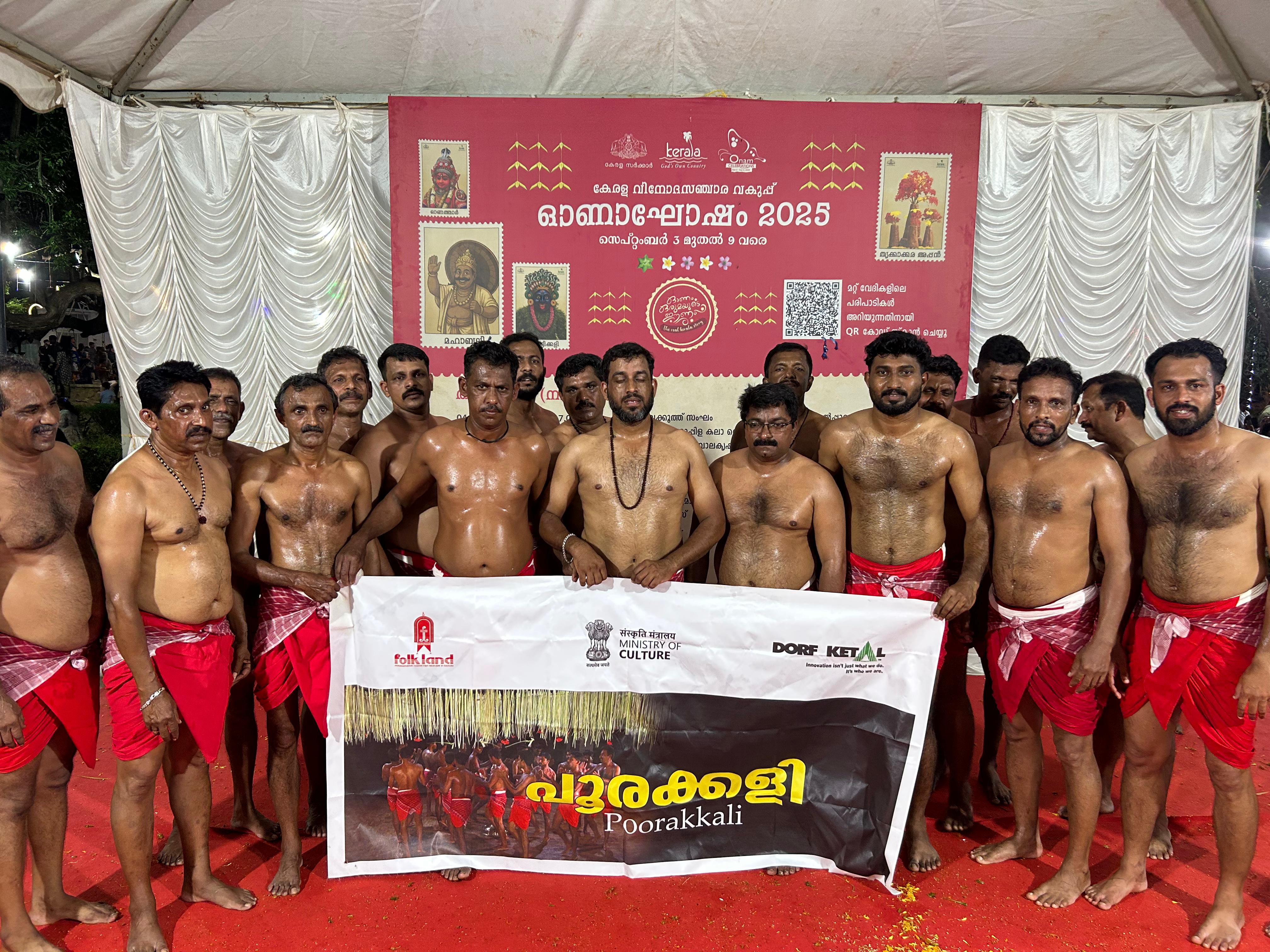 Folkland International Centre for Folklore and Culture presented Poorakkali, the traditional male dance of North Kerala, at the Onam Tourism Week celebrations in Kanakakkunnu, Thiruvananthapuram, led by Shri K. Sureshan with 19 skilled dancers. The vibrant performance earned high acclaim, and heartfelt thanks are extended to Shri Pramod Panicker, Shri P.V. Jayachandran, the Monacha Bhagavathi Temple Poorakkali troupe, and Dorf Chemicals India for their support.